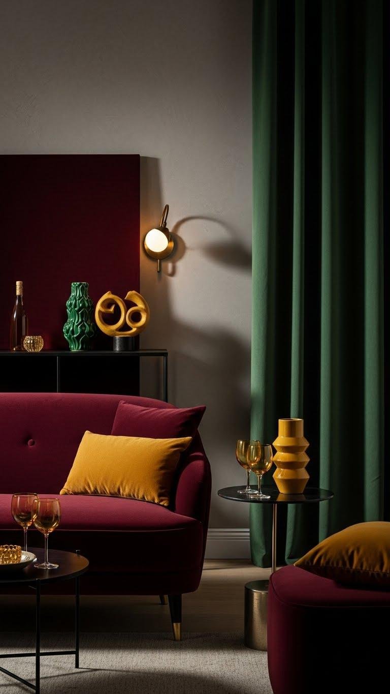 Balancing rich wine tones with punchy emerald and mustard creates a luxe, modern palette that feels both dramatic and deliberate—you’ll want to let each color play a clear role. You’ll anchor rooms with wine backed emeralds on upholstery and drapery, then punctuate surfaces with mustard accented glassware and sculptural accents. Dare to layer textures, keep contrasts intentional, and let the trio sing.