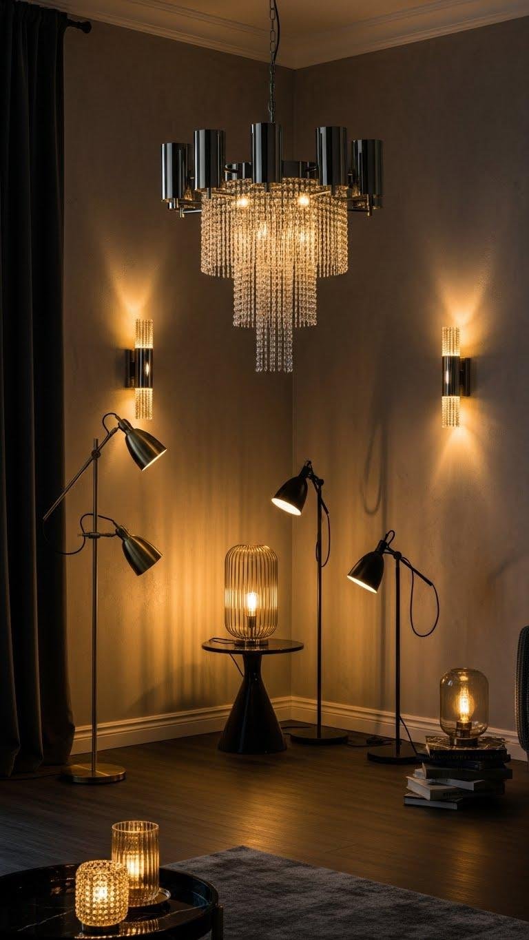 Pull together a layered lighting plan that reads like the room’s signature accessory: chandeliers set the tone, floor lamps sculpt pockets of intimacy, and sconces punctuate walls with cinematic wash.