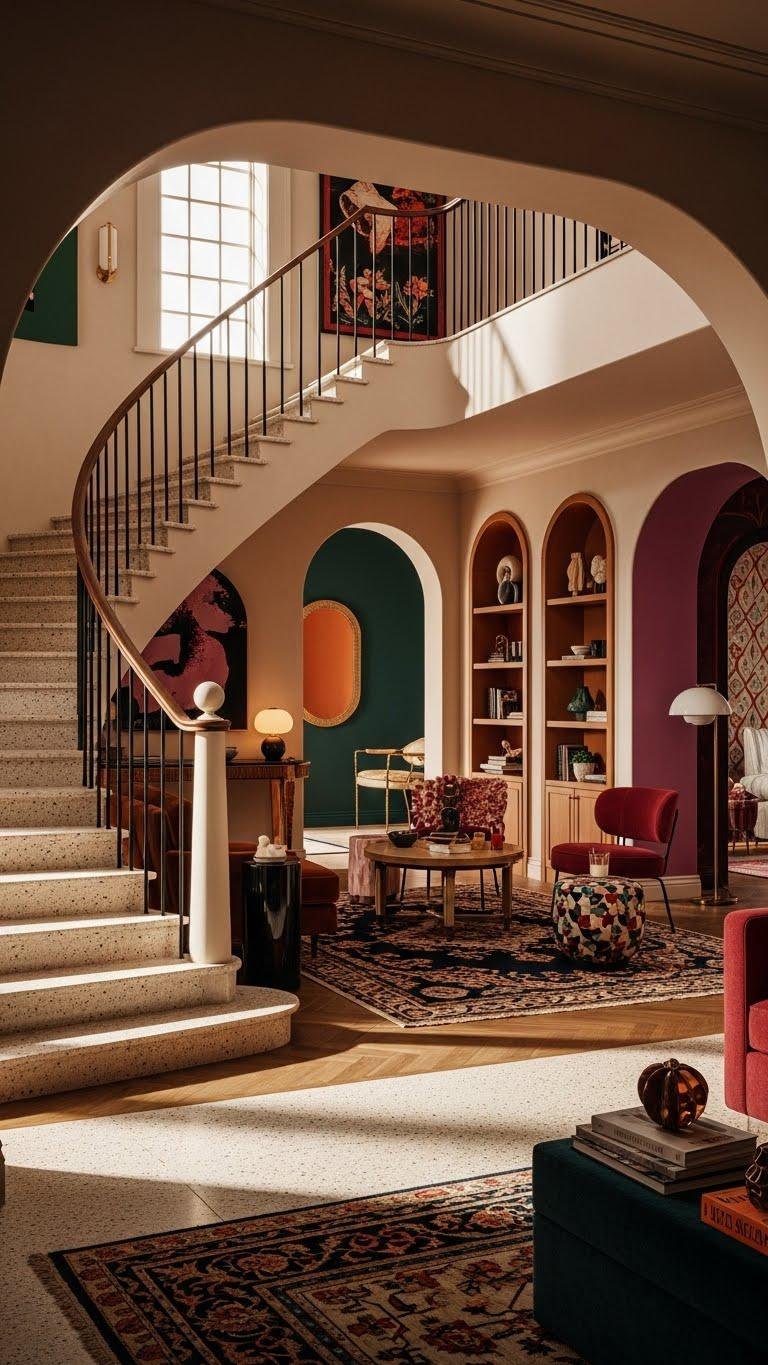 Anchoring your maximalist scheme with curvy architectural details softens the visual chaos and gives your rooms a confident, design-forward backbone.
