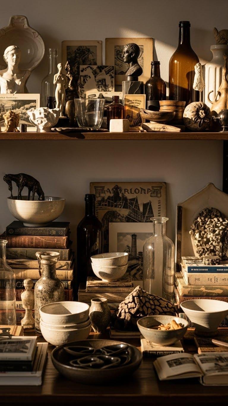 When you gather objects into curated clusters, you turn accumulated treasures into intentional moments that read as one confident design move. You’ll arrange curated miniatures by scale and story, anchor groups with bold silhouettes, and choose themed colorways to unify contrast.