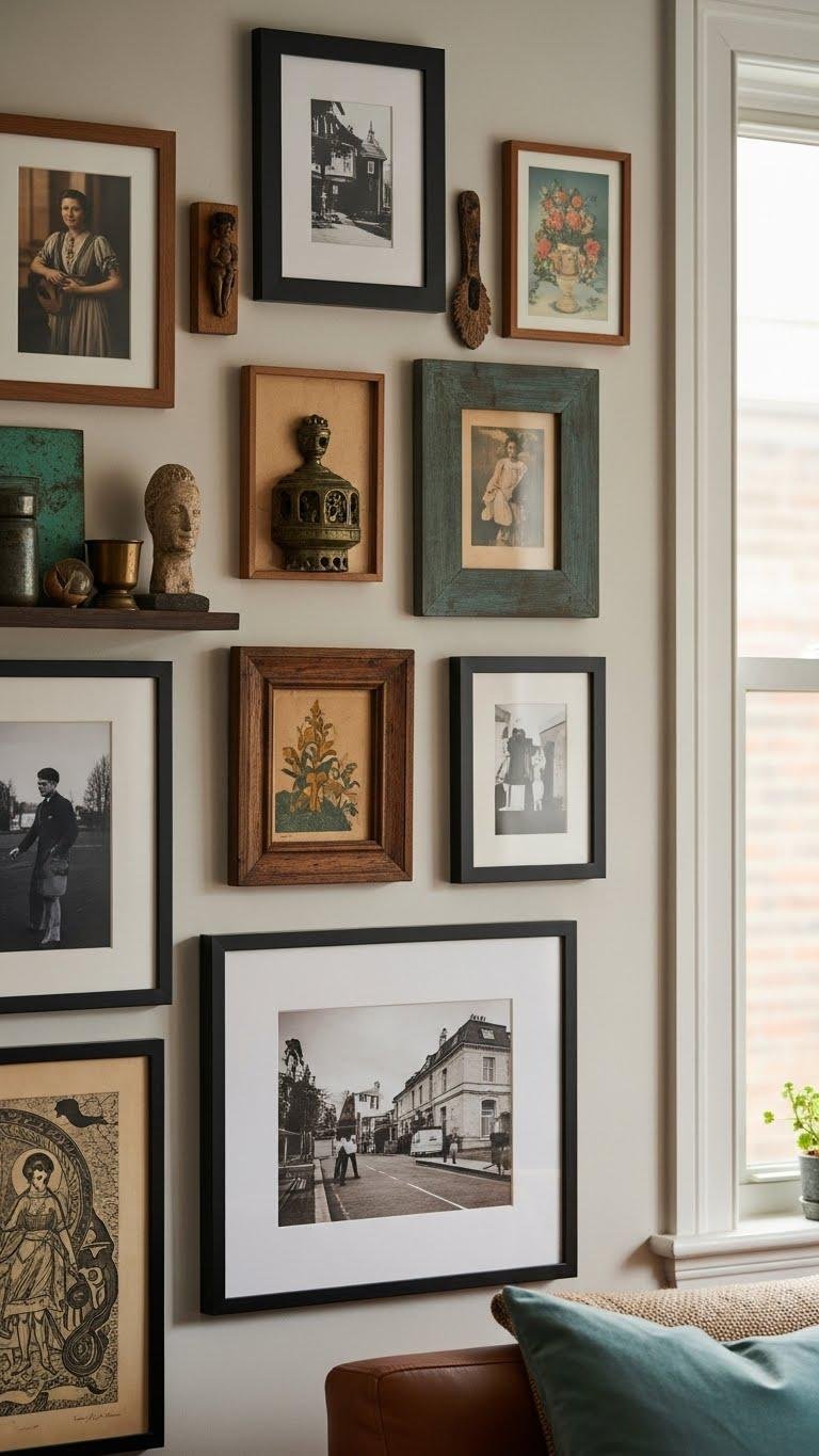 After you’ve balanced vintage patina with modern lines, let your walls do the rest of the storytelling: curate a gallery that reads like a collected life rather than a catalogue. You’ll arrange photo narratives, prints and objects with intentional heirloom sequencing, mixing scale, color and texture. Trust rhythm over symmetry, edit ruthlessly, and let each piece claim its moment — bold, personal, uncontainable.