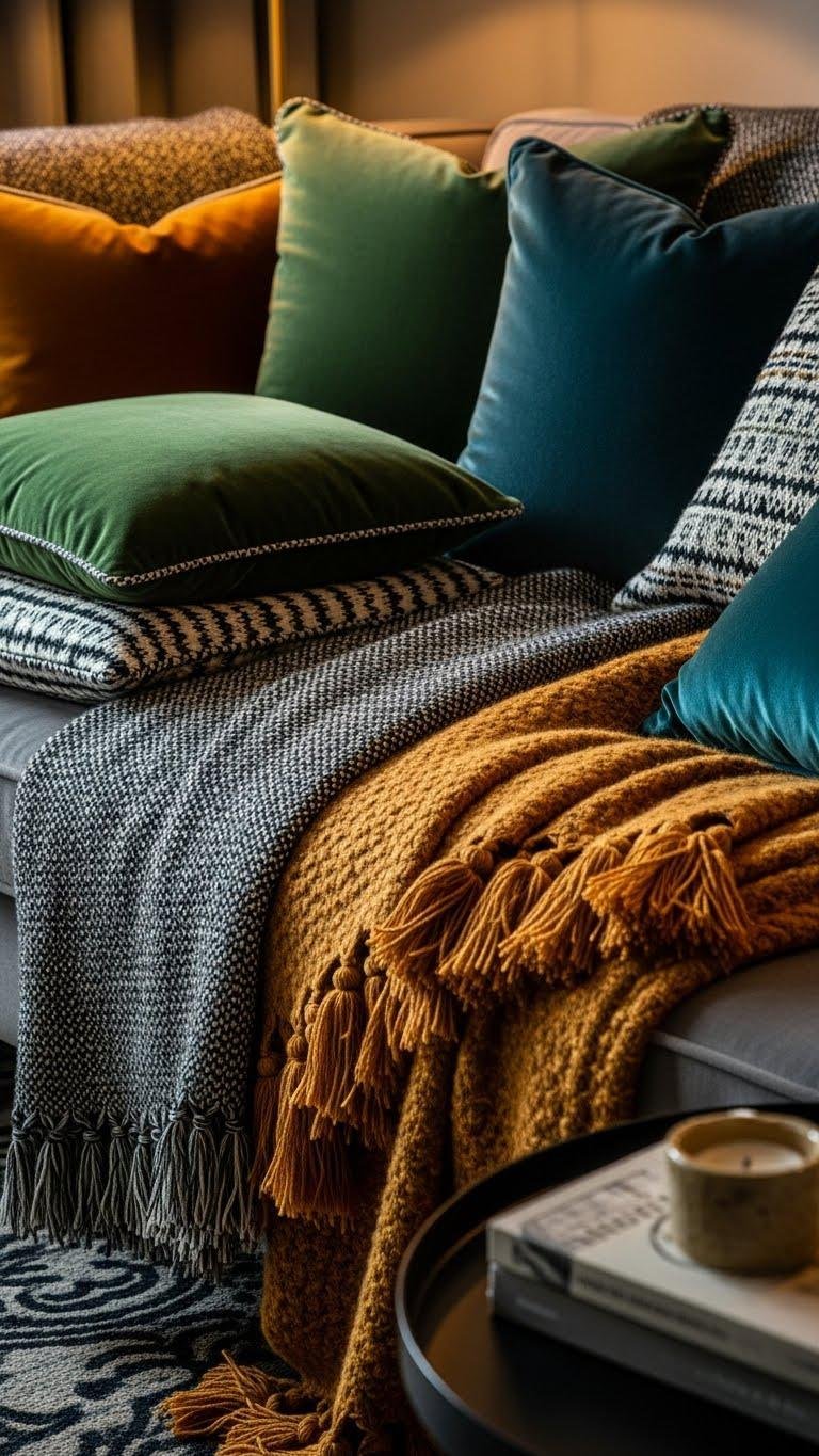 Drape a velvet sofa in jewel-toned throws and bold pillows to make the seating a centerpiece that reads loud and deliberate — think saturated emeralds, deep ochres, and smoldering teal that play against the fabric’s plush sheen. You’ll pair velvet drapery with monochrome layering, mix patterned piping on cushions and tasseled throws, and confidently curate contrasts that celebrate personal freedom.