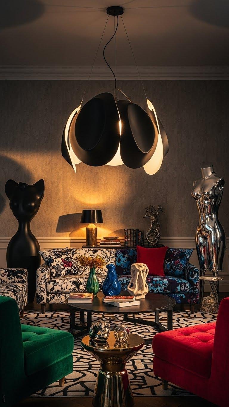 Bring in an oversized sculptural light and let it claim the room — these fixtures act like wearable art, anchoring a maximalist scheme with dramatic scale and personality.