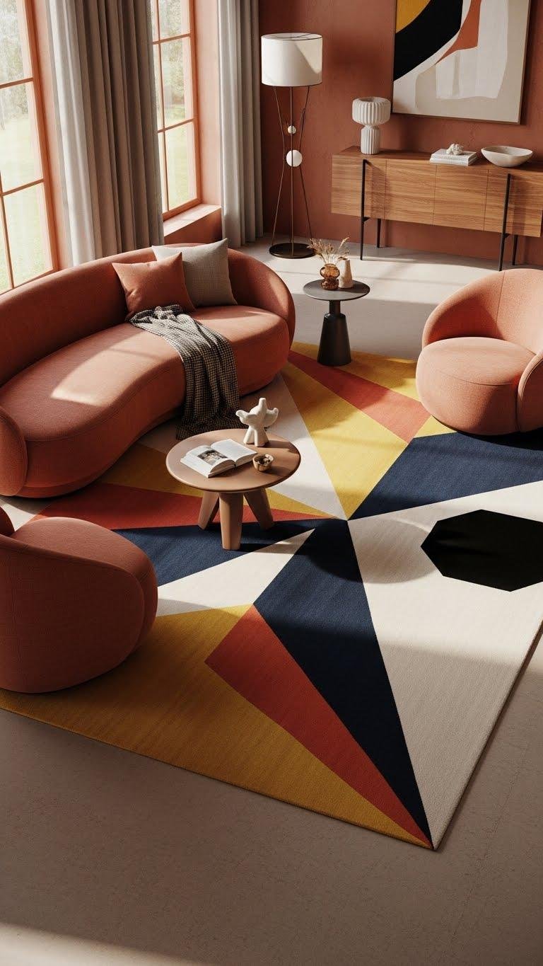 Why not lean into contrast? You’ll pair curved silhouettes with sharp graphic rugs to create electric geometric contrast that anchors free-spirited rooms.