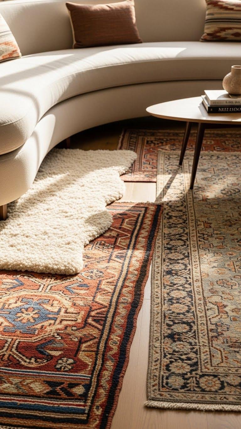 You’ll embrace rug layering to define zones, stagger patterns and scale, and exploit texture contrast—plush over flatweave, distressed atop kilim—to create bold, liberated rooms that feel intentionally collected rather than cluttered.