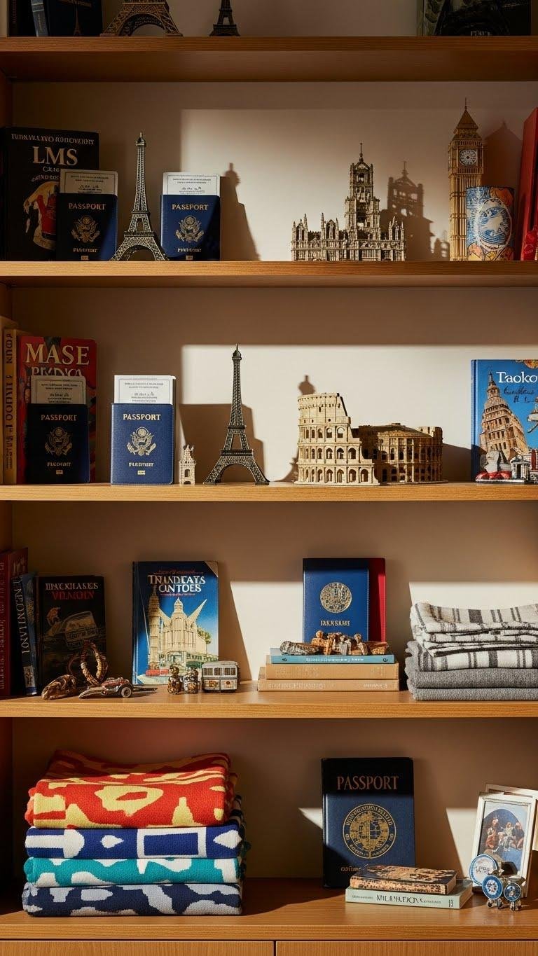 When you arrange open shelves with travel souvenirs, think like a curator: group items by color, scale, or story to make each shelf read as a deliberate vignette rather than a jumble. You’ll mix passport covers, miniature landmarks, textiles and books, alternating heights and negative space. Let bold pieces anchor each shelf, invite wanderlust, and reflect your free, adventurous spirit without clutter or chaos.