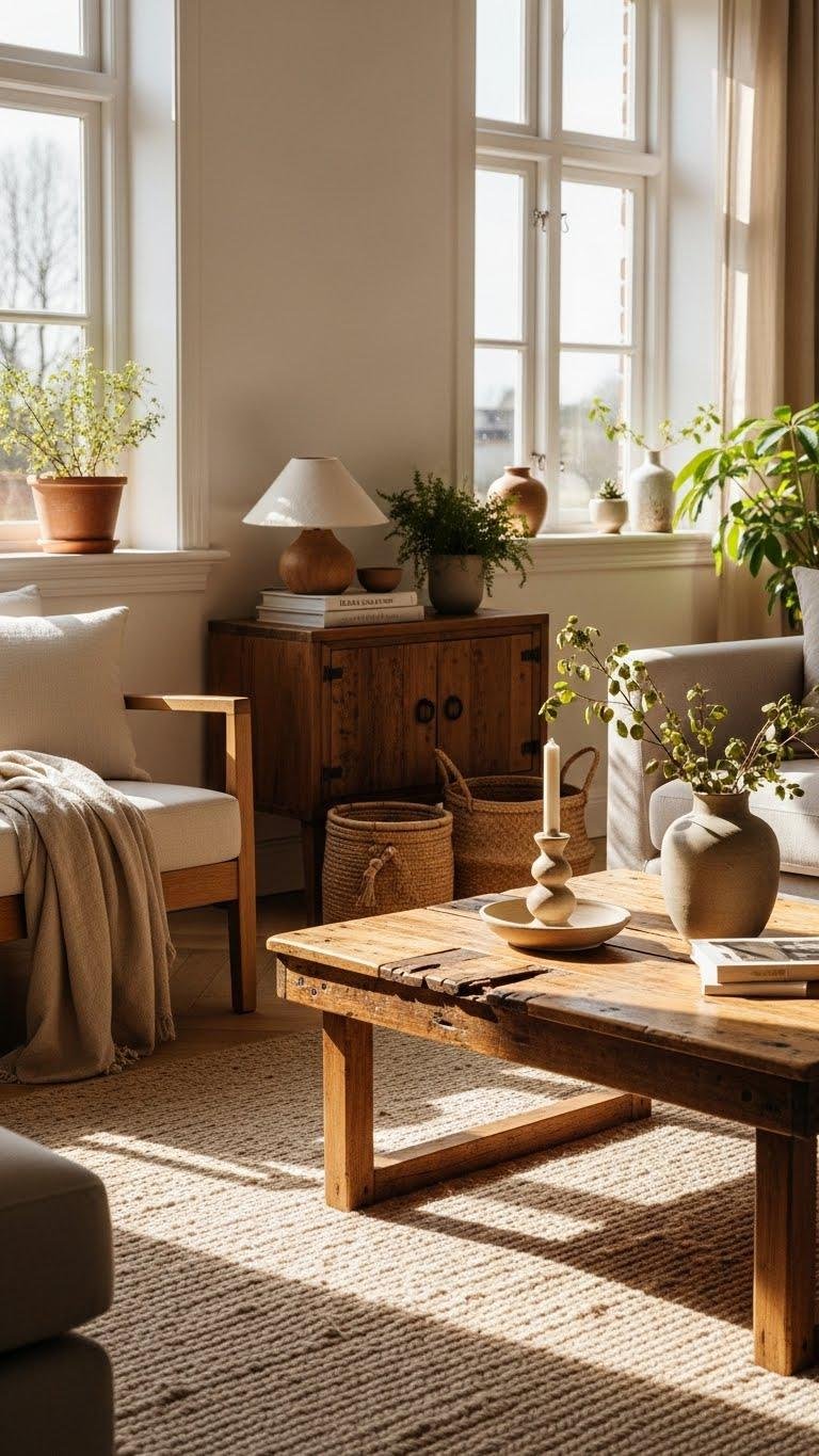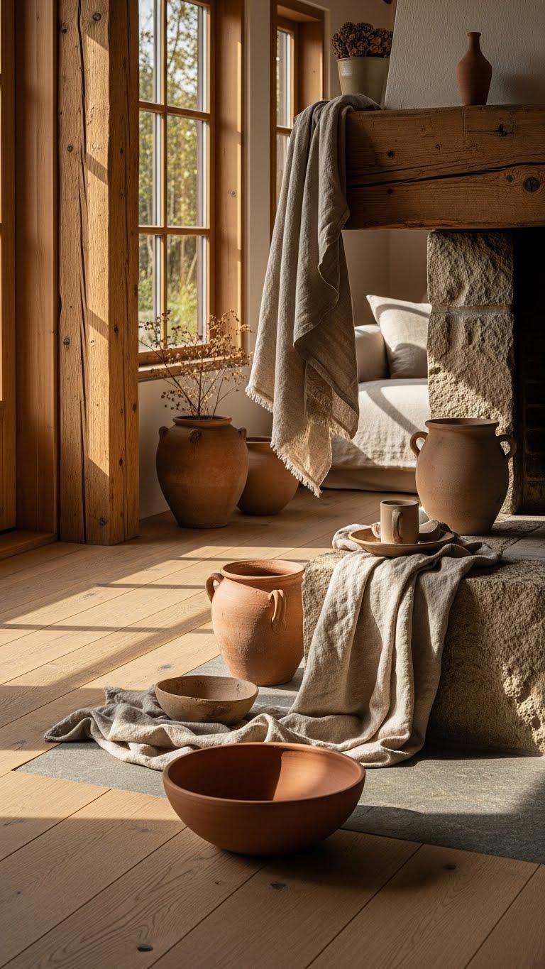 Choose materials that feel rooted and honest—stone, raw wood, linen, terracotta, and unglazed ceramics immediately add warmth and texture without fuss. You’ll pair raw timber floors or beams with hemp textiles and neutral throws to craft calm, breathable rooms. Pick finishes that age gracefully, let surfaces show character, and favor tactile simplicity so your space breathes freedom, clarity, and lasting style.