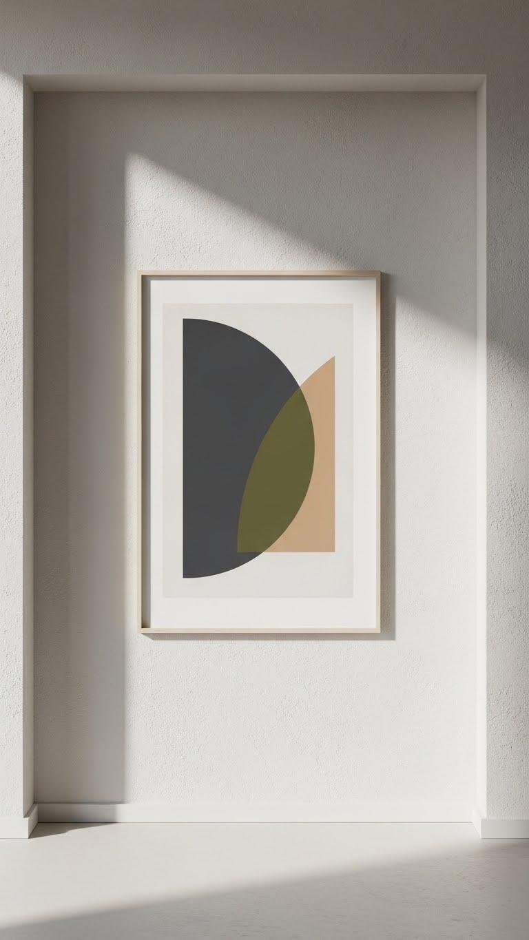 After carving a quiet alcove, carry that same restraint to the walls by framing minimal art with bold shapes that anchor the room without shouting.