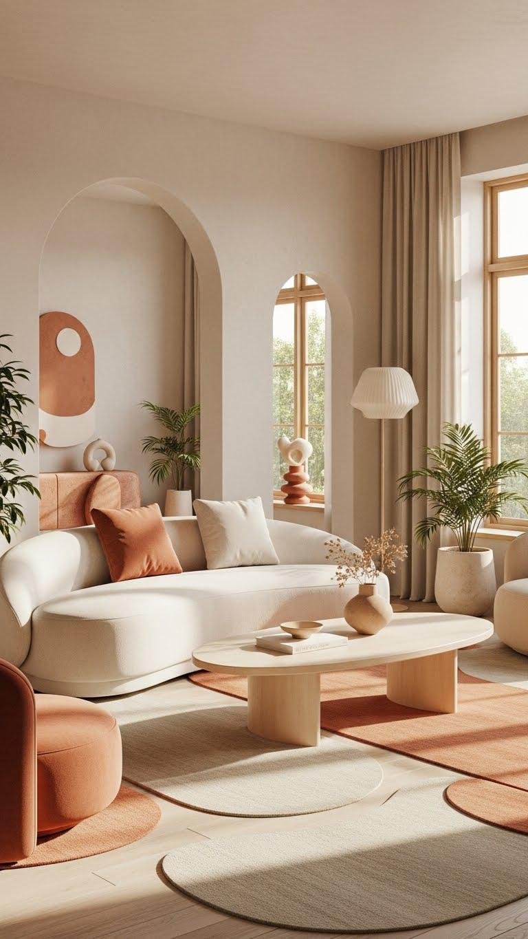 When you soften a room’s geometry with curved silhouettes and rounded edges, the space feels more inviting and modern—think arched doorways, crescent-back sofas, and oval coffee tables that guide movement and sightlines.