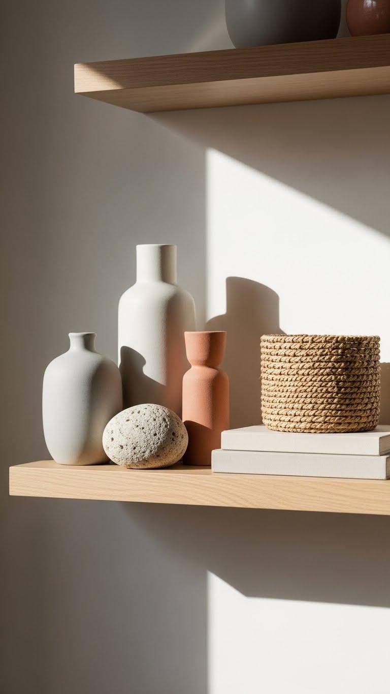 Curate your shelves with intention: pick a few functional, beautiful objects that balance scale, texture, and negative space. You’ll create balanced asymmetry by grouping varied heights and shapes, leaving air between pieces. Arrange tactile vignettes—stone, woven fiber, matte ceramics—to invite touch without clutter. Choose items that serve you, reflect freedom, and let the shelving feel calm, curated, and effortless.