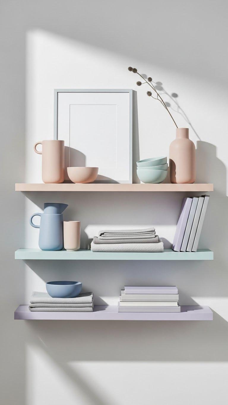 After you’ve pared shelves down to tactile, purposeful pieces, let color become the quiet anchor: pick one pastel family and layer it across ceramics, textiles, and paperbacks to create a cohesive, calming rhythm.