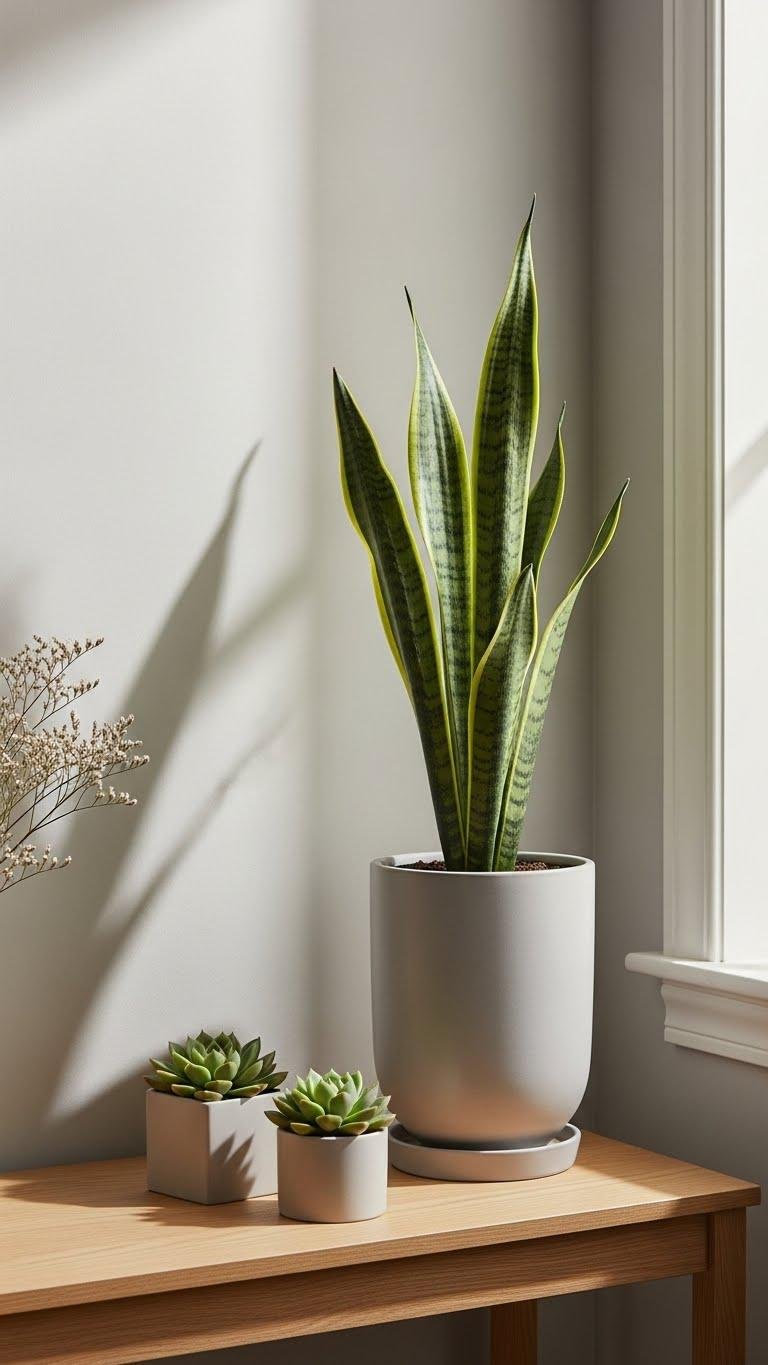 When you bring plants into a minimalist room, choose restraint: a single sculptural snake plant or a small cluster of succulents can add life without cluttering the sightlines. You’ll favor low maintenance succulents in clean pots, occasional sculptural dried florals for texture, and deliberate placement near light.