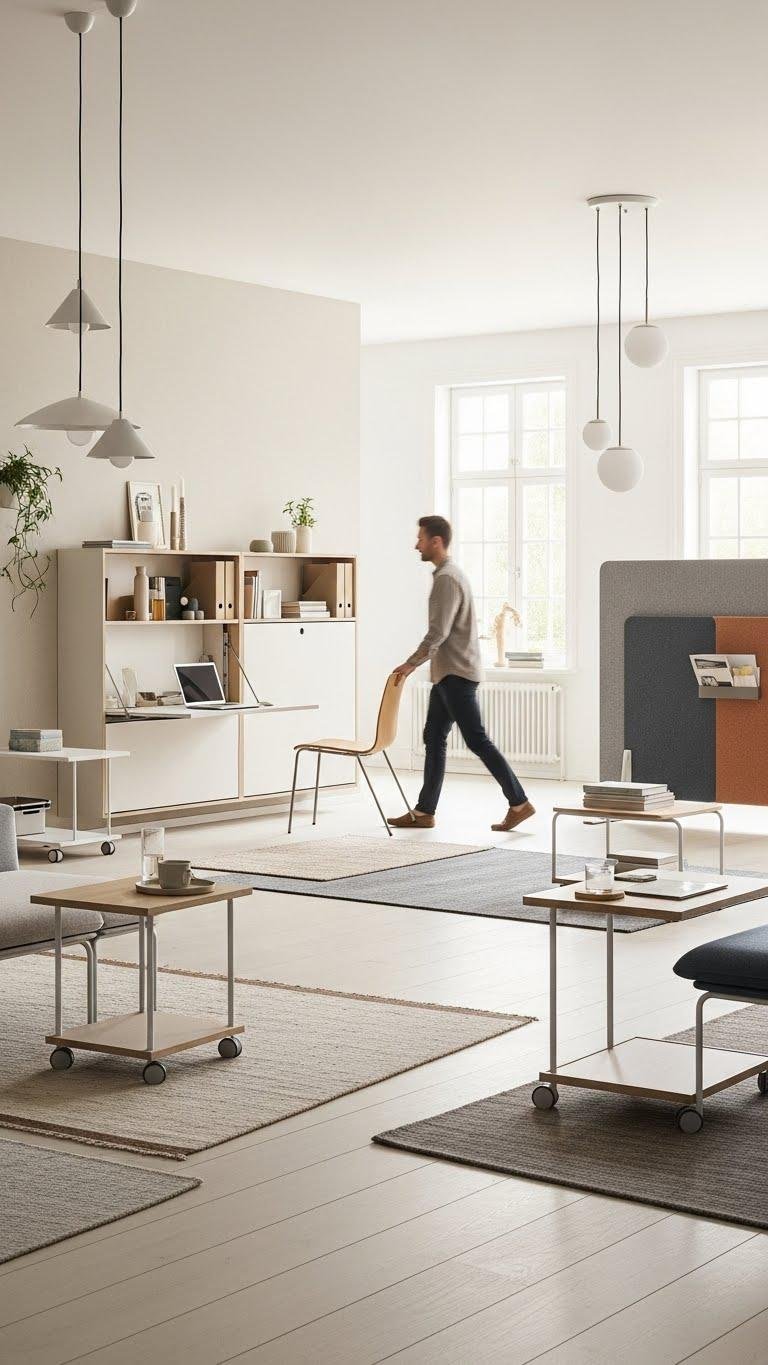For rooms that must do double duty, prioritize clear sightlines and movable elements so the space shifts as easily as your needs do; think slim-profile furniture on casters, foldaway surfaces, and defined zones marked by rugs or lighting rather than heavy dividers. You’ll create calm, flexible areas with acoustic zoning for focus, hidden storage to declutter, and minimal palettes that let function and flow feel liberating.