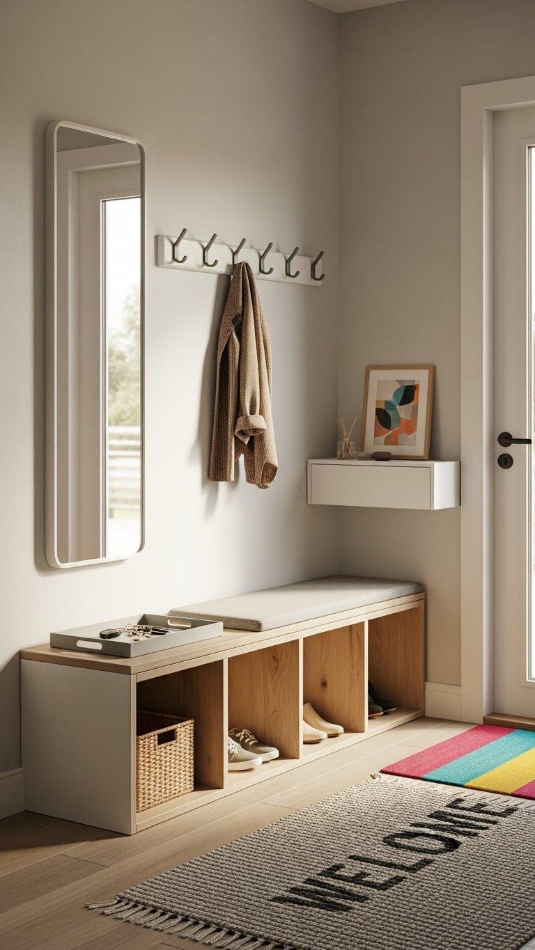 Choose minimalist hooks, a tactile welcome mat, a slim mirror, and a single tray for keys so you move through with ease.