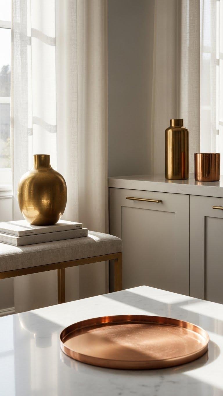 Emphasize a few pieces: a warm brass vase, rose copper tray, or slim hardware to punctuate clean lines. You’ll keep spaces airy while enjoying subtle richness; choose quality finishes for lasting, effortless style.