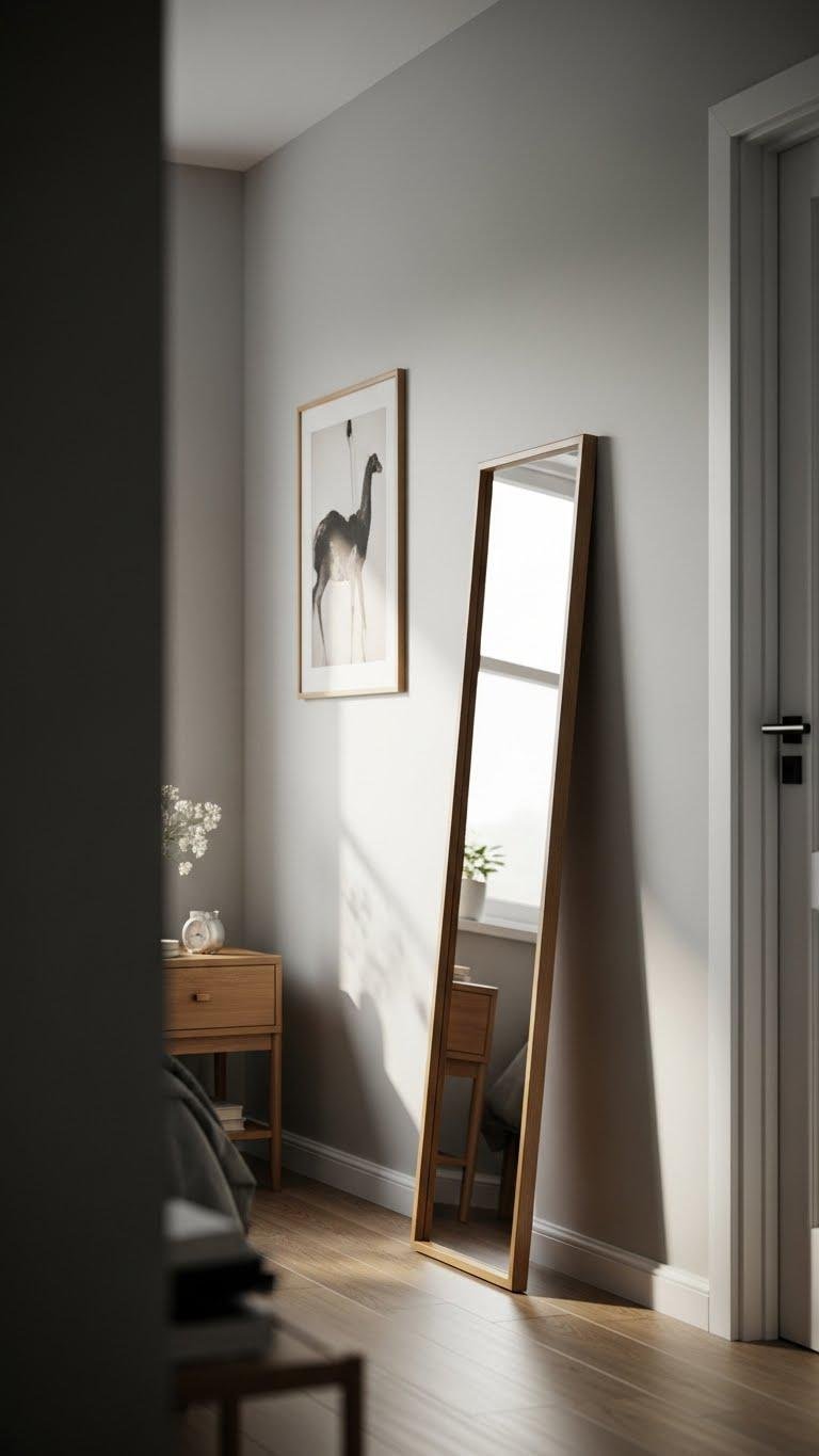 If you’re working with a tight hallway or skinny bedroom wall, mounting a full-length mirror turns cramped space into a visual runway; it stretches sightlines, bounces light, and gives you a practical spot to check outfits. You’ll love the narrow reflection that creates depth and the vertical emphasis that lifts ceilings. Choose slim frames, lean it casually, and let the mirror free your room’s rhythm.
