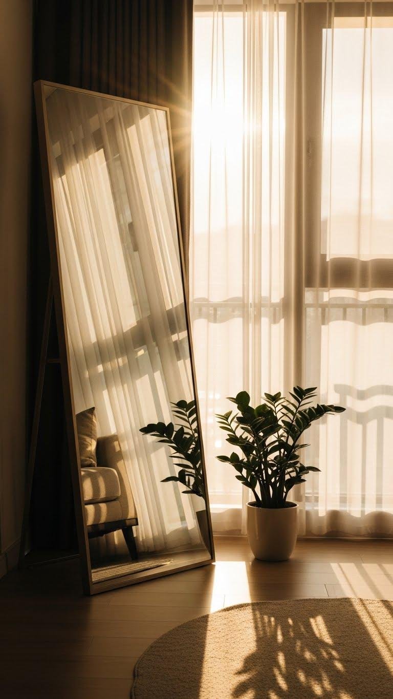 You’ll maximize sunlight bounce with smart window placement, angle the mirror to catch morning glow, and use curtain reflection to soften edges. Position a plant to cast a striking plant silhouette, adding depth and effortless freedom.