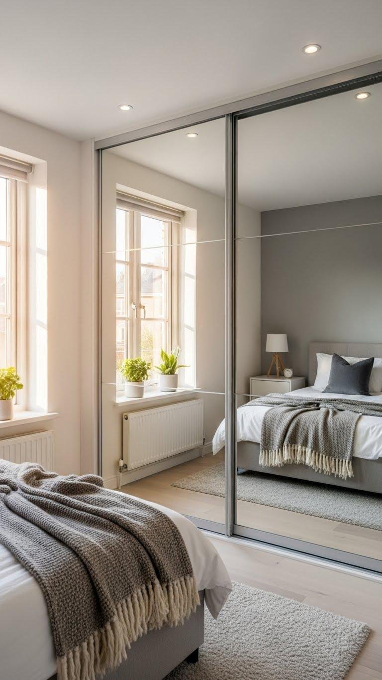 When you slide open mirrored wardrobe doors, the room immediately reads larger and brighter, the reflections extending sightlines and amplifying natural and artificial light.