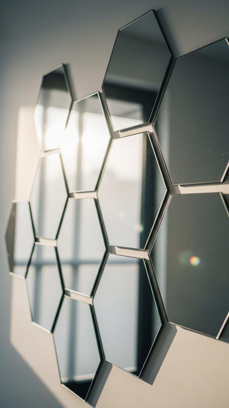 A hexagonal mirror array injects instant geometric energy into a room, breaking up flat walls with a hive-like pattern that catches and multiplies light.