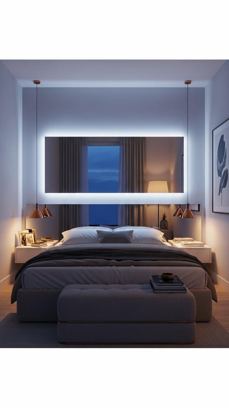If a floor mirror can stretch a corner and catch daylight, a mirrored headboard will do the same for a small bedroom while you sleep.