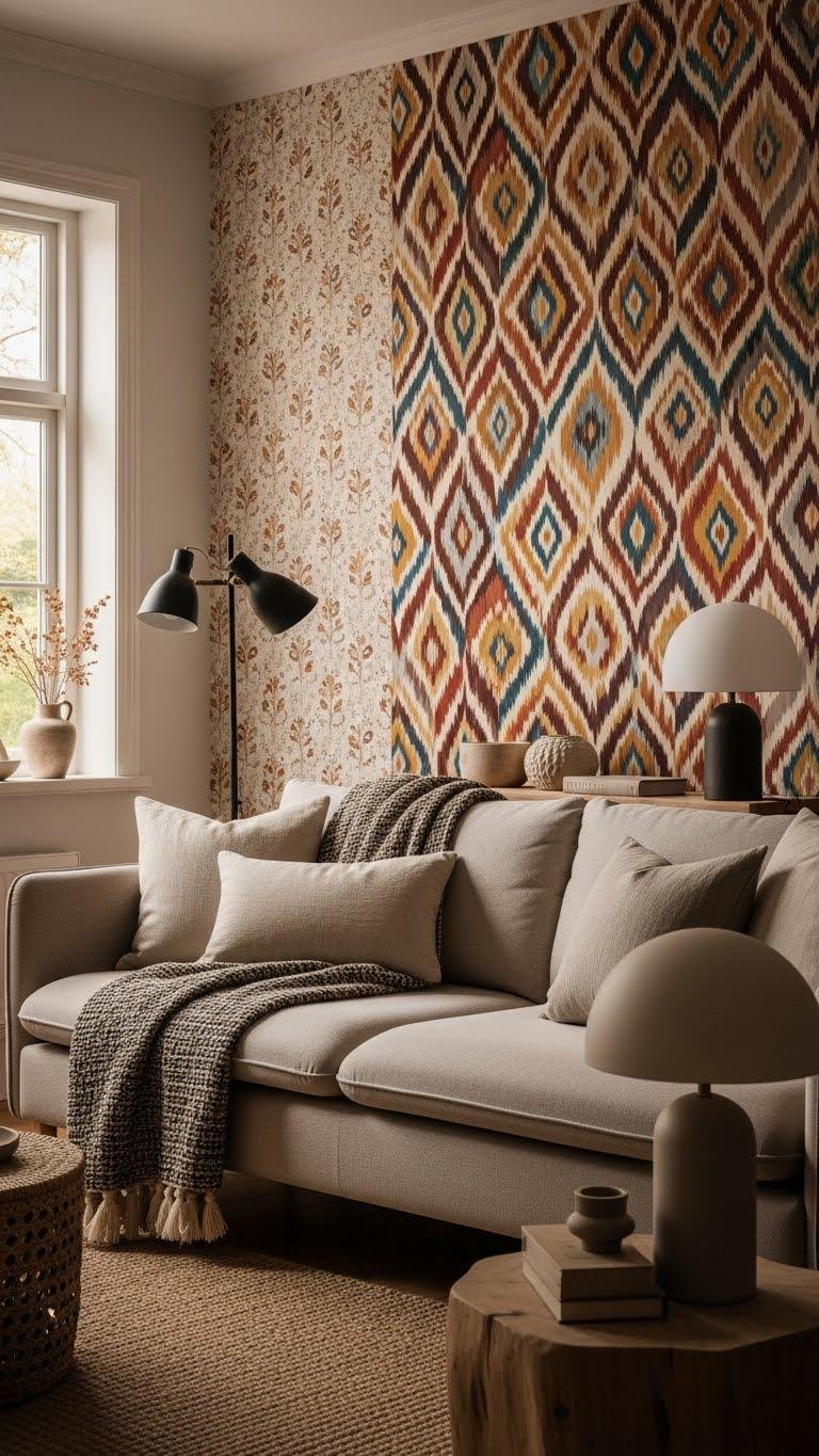Choose a subtle floral damask for vintage warmth or a bold geometric ikat to energize free-spirited spaces. Balance pattern with solid furnishings, limit scale to one focal wall, and let texture and color carry the mood.