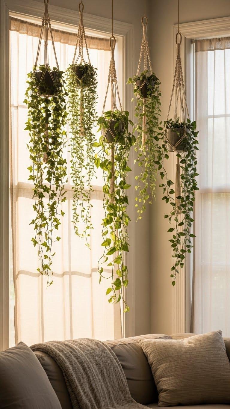 Those soft window treatments set a gentle stage for plants to thrive — hanging foliage brings that softness down into the room, adding movement, vertical interest, and a living texture that complements linens and light. You’ll choose air purifying varieties and trailing ivy in macramé hangers, create a compact vertical garden, and enjoy freedom to arrange, swap, and style greenery for a calm, breathable space.