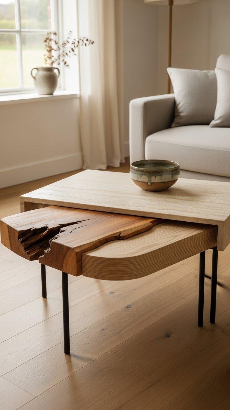 Anchor your seating area with a sculptural coffee table crafted from natural materials—think hand-carved teak, honed travertine, or blown-ash plywood—that doubles as functional furniture and a focal art piece. You’ll pair live edge slabs with slim metal legs, place a handcrafted stoneware bowl for contrast, and let the table’s organic silhouette set a liberated, calm tone without crowding the room.