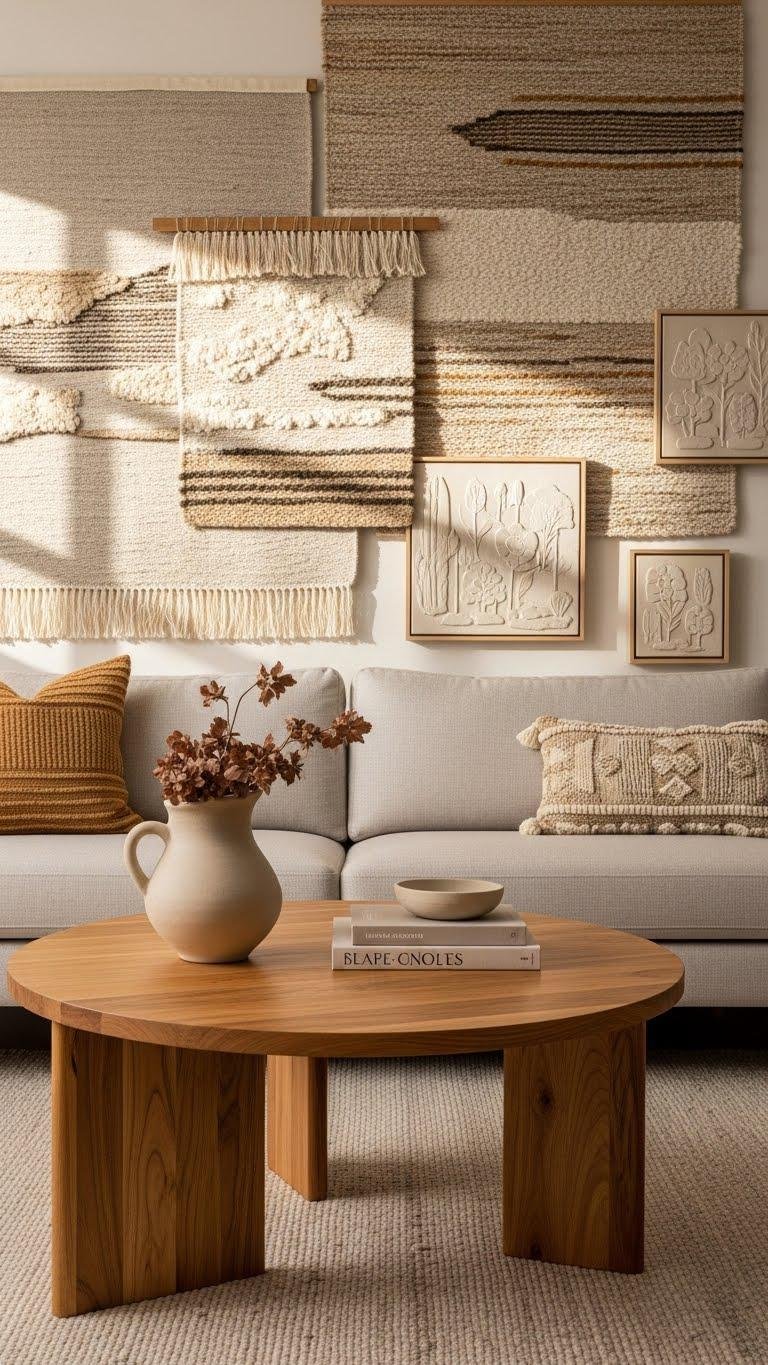 After you’ve settled on a sculptural coffee table as the room’s tactile centerpiece, bring that same sense of materiality up onto the walls with textured art and tapestries that echo natural fibers and handcraft.