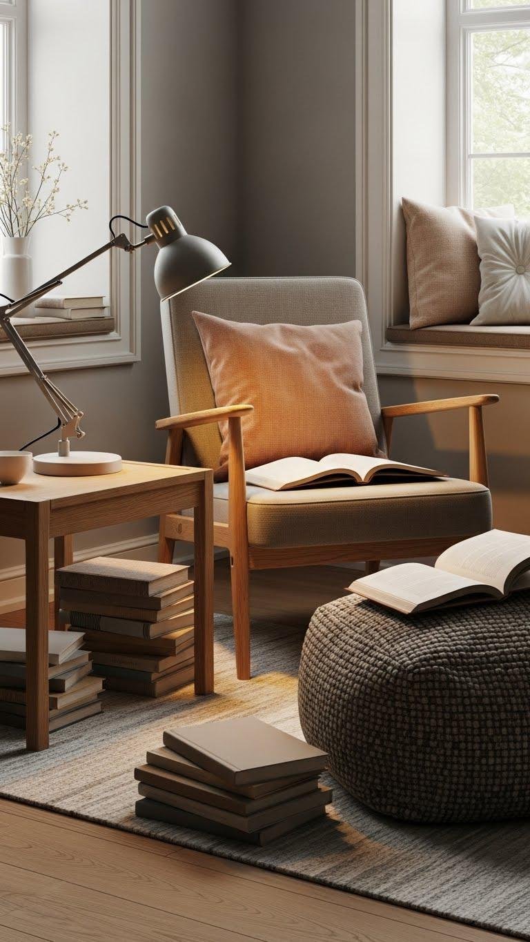 Carve out a quiet corner with a cushioned chair, a low side table, and a focused task lamp so you can read without straining your eyes or disrupting the room’s flow.