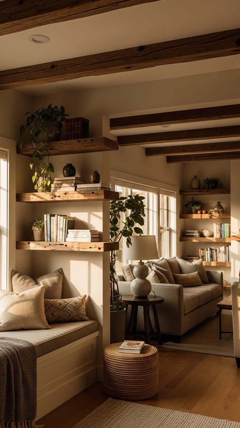 After you’ve set up a sunlit reading nook, bring the same warm, lived-in feel into the rest of the room with reclaimed wood elements. You’ll anchor space with kiln dried beams and floating reclaimed shelving for books and plants. Choose simple finishes that reveal grain and history. The result feels free, grounded, and intentional—durable character that ages beautifully without fuss.
