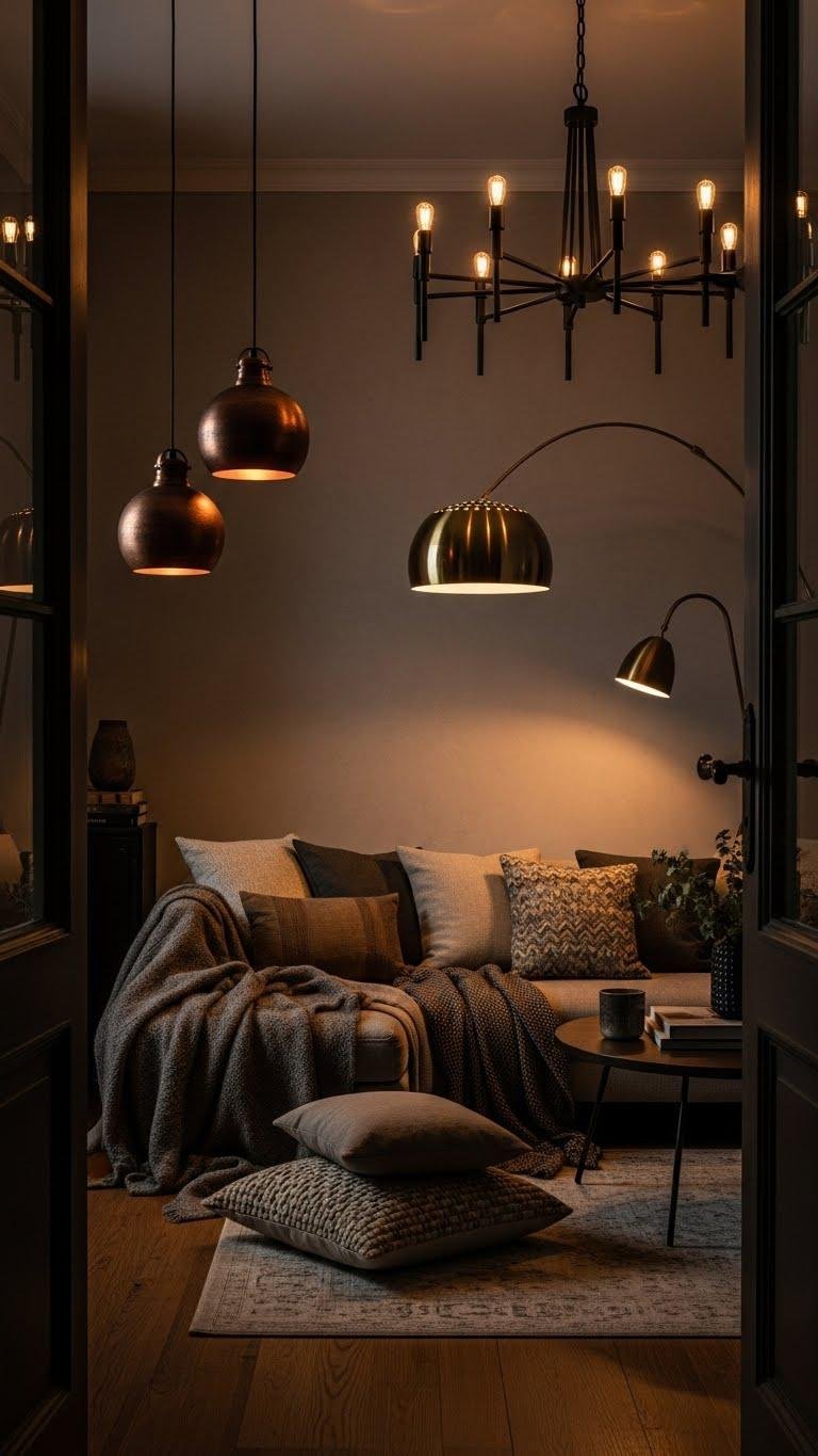After you’ve layered cushions and mixed throws to add depth, bring the eye upward with statement lighting in warm metals. Choose fixtures in oxidized copper or matte brass to anchor the room and reflect soft light. Suspended pendants, arc lamps, or bold chandeliers create focal points that feel both grounded and freeing — you’ll control mood through finish, scale, and directional glow.