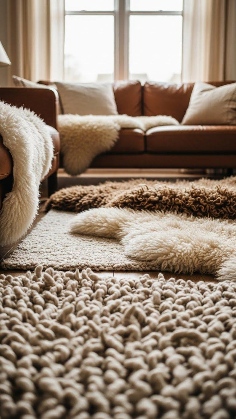 Leather pieces set a warm, tactile foundation, and layering in wool and sheepskin rugs amplifies that cozy feeling while softening hard lines. You’ll relish barefoot comfort and visual depth—chunky wool piles, curly sheepskin accents, neutral palettes that breathe.