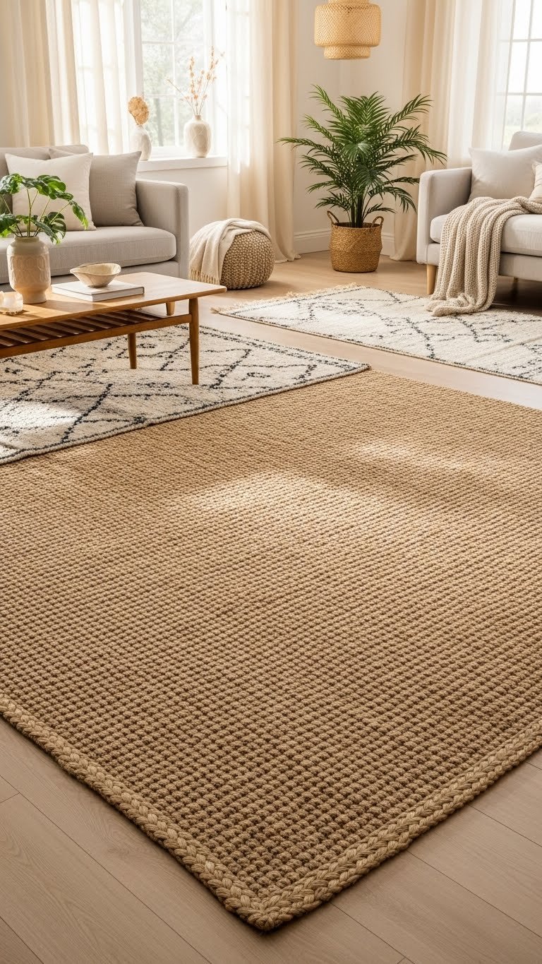 A natural jute rug anchors your neutral scheme with immediate texture and earthy warmth, giving floor space weight without stealing the spotlight.