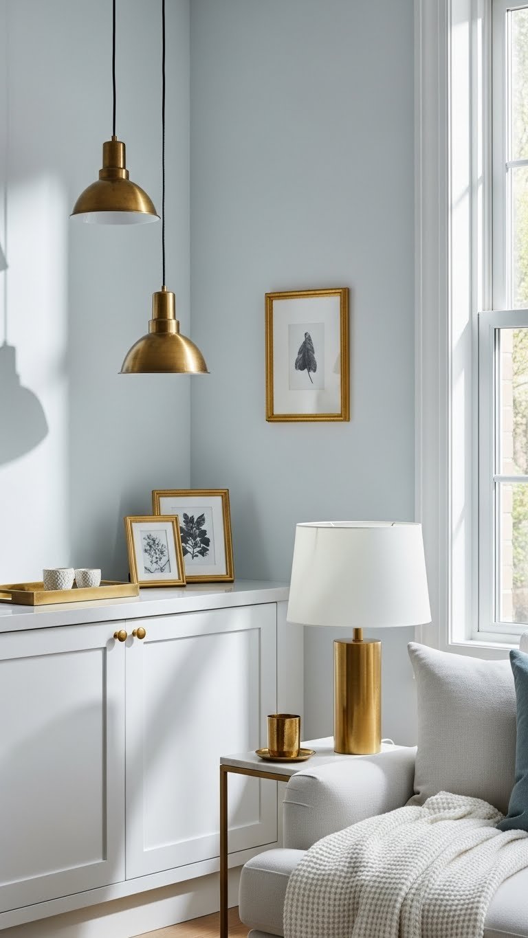 Although cool whites give your space a crisp, modern base, pairing them with antique brass accents warms the palette and adds approachable luxury.