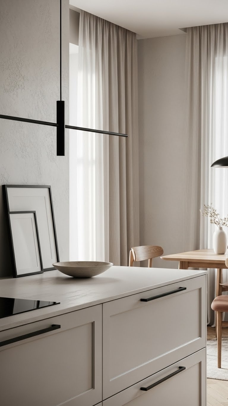 Anchor the soft, organic palette with matte black accents that instantly sharpen the room’s composition and add modern drama without overwhelming the calm. You’ll balance restraint and edge by choosing matte black hardware on cabinetry, slim lighting fixtures, and picture frames. These dramatic contrast accents define sightlines, emphasize texture, and let you express a confident, liberated aesthetic while keeping the space timeless and serene.