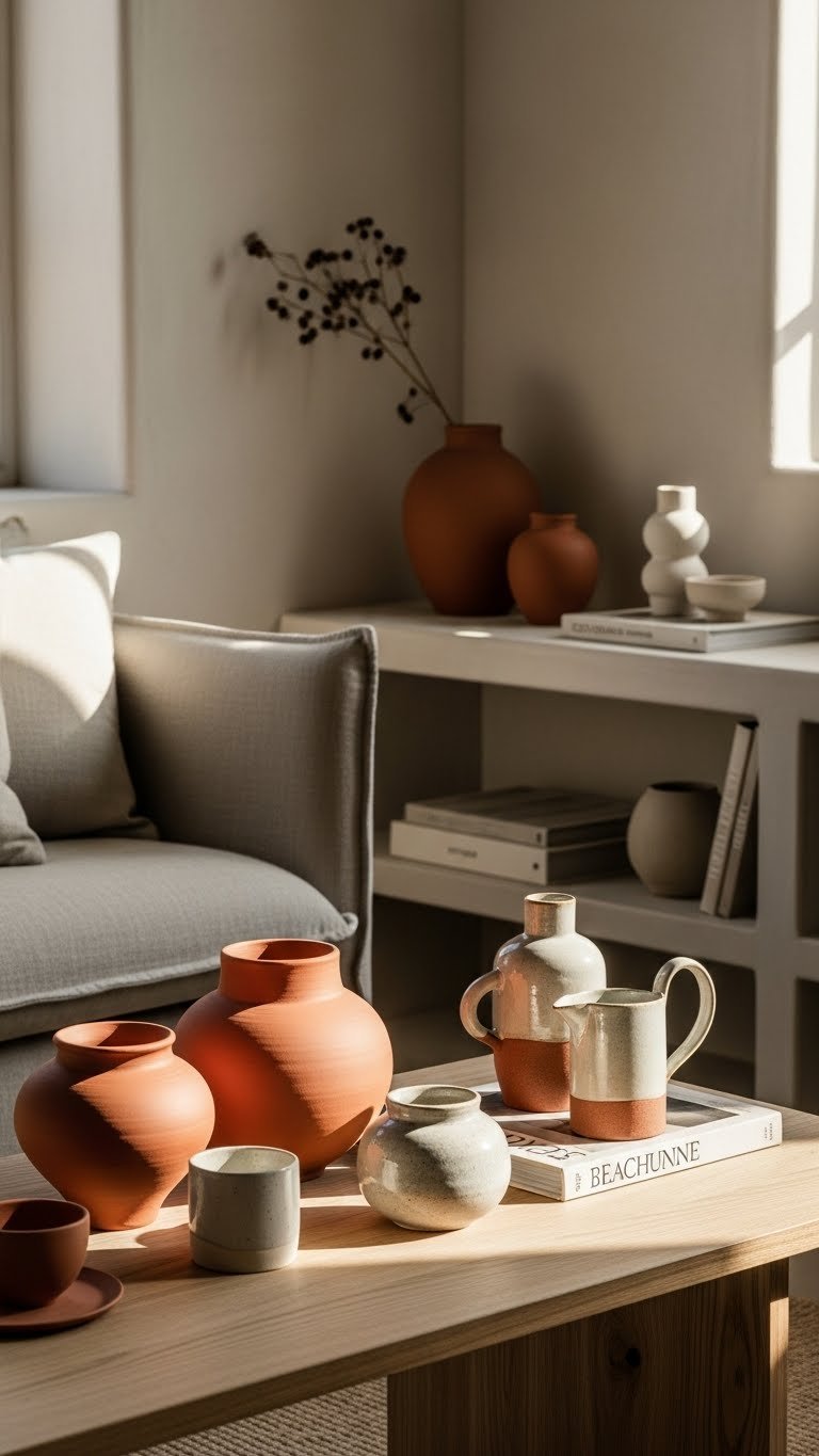 Bring in terracotta and ceramic accents to add subtle warmth and tactile contrast to a neutral living room without breaking its calm. You can mix matte terracotta pots, sculptural ceramics and pieces with handmade glazes to create depth. Rotate objects for seasonal styling, keep groupings deliberate, and let imperfect finishes suggest ease — it’s restrained, personal, and endlessly adaptable.