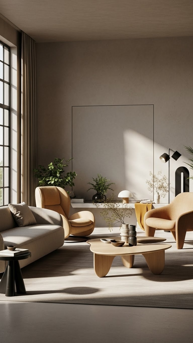Choose pieces with sculptural silhouettes and statement curves — a rounded sofa, cantilevered chair, or asymmetrical coffee table — so you can create a liberated, refined space.