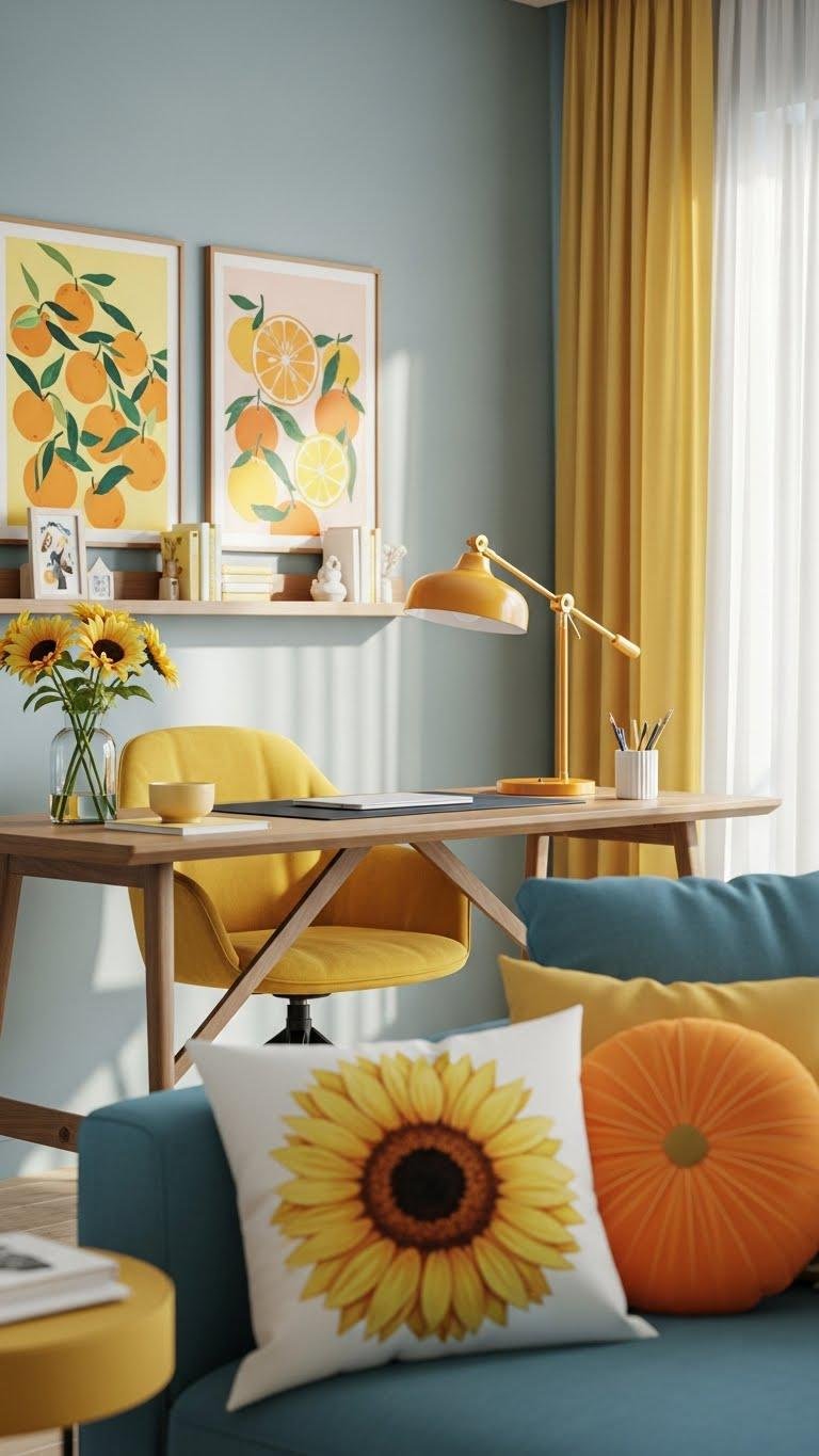 To brighten that calm blue-green base, introduce pops of vibrant yellow or orange that spark energy without overwhelming the room. You’ll place citrus art above a desk, choose accent pillows in sunflower or tangerine hues, and add a sleek lamp with a warm shade. These intentional bursts lift mood, guide focus, and let you work freely while keeping the palette balanced.