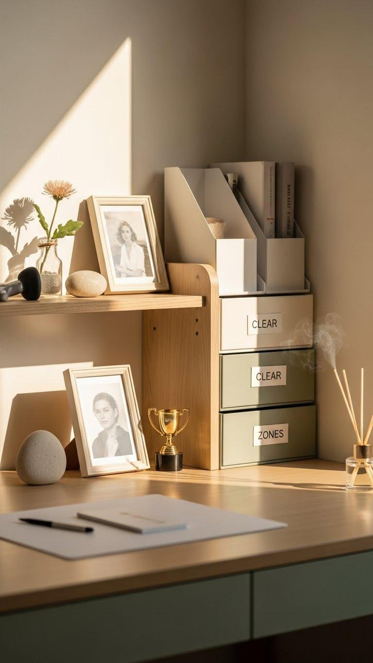 Once your storage keeps clutter off the desk and zones are clearly labeled, bring in a few personal touches that make the space feel like yours. Choose a small frame or two, arrange memory trinkets that spark calm and ambition, and limit items to maintain openness. Add subtle desk scenting—a single reed or roller—to evoke focus without overwhelming freedom or visual flow.