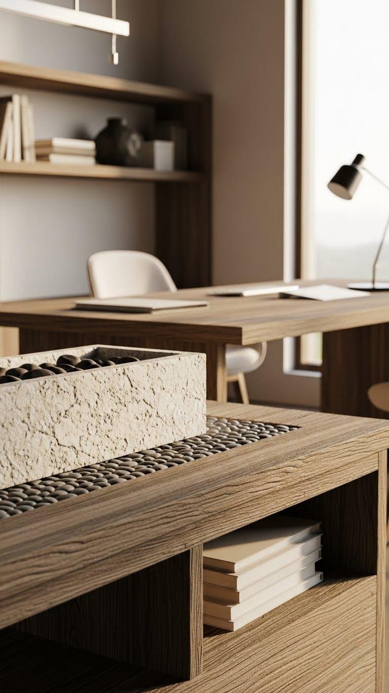 Bring warm, tactile surfaces into your office by layering wood and stone for both beauty and durability.