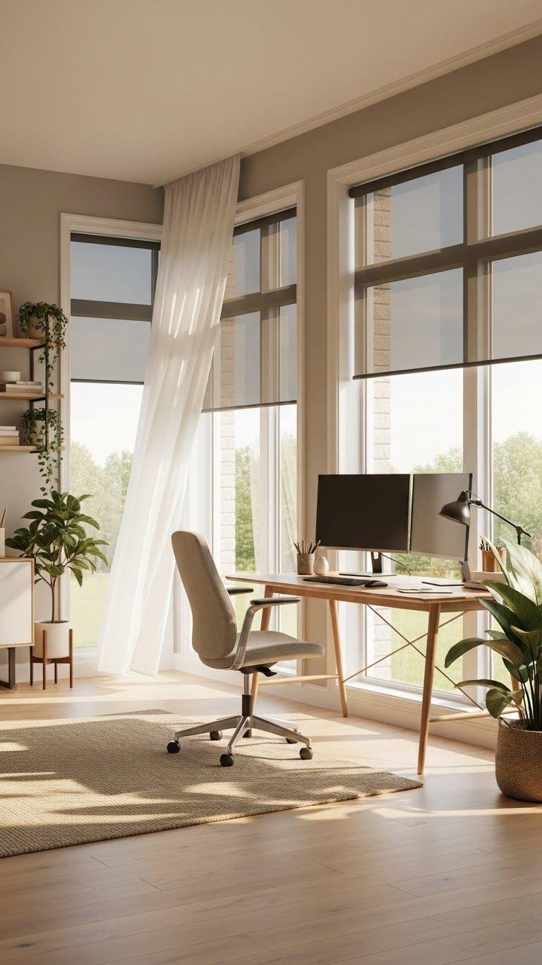 You’ll track sun angle seasonally, tilt blinds for soft diffusion, and choose sheer curtains for balanced illumination. Implement glare control with adjustable shades and matte surfaces so light liberates focus without harsh reflections or interruptions.
