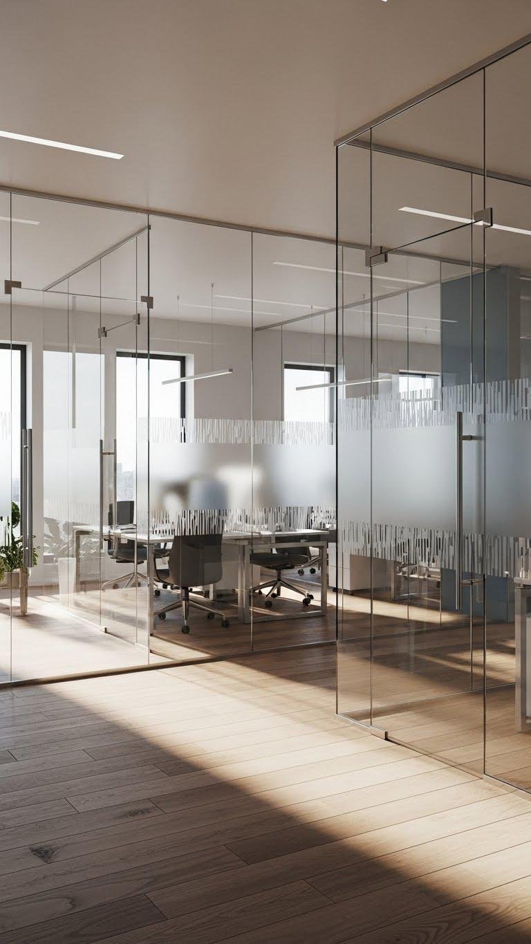 Bring light through while carving out focus: glass partitions let you define zones without boxing people in, so daylight travels deep into the plan while acoustic films, frit patterns, or frosted bands give visual privacy where it matters. You’ll choose frameless elegance or slim profiles, apply frosted privacy selectively, and balance transparency with sound control so teams feel open, mobile, and respected.