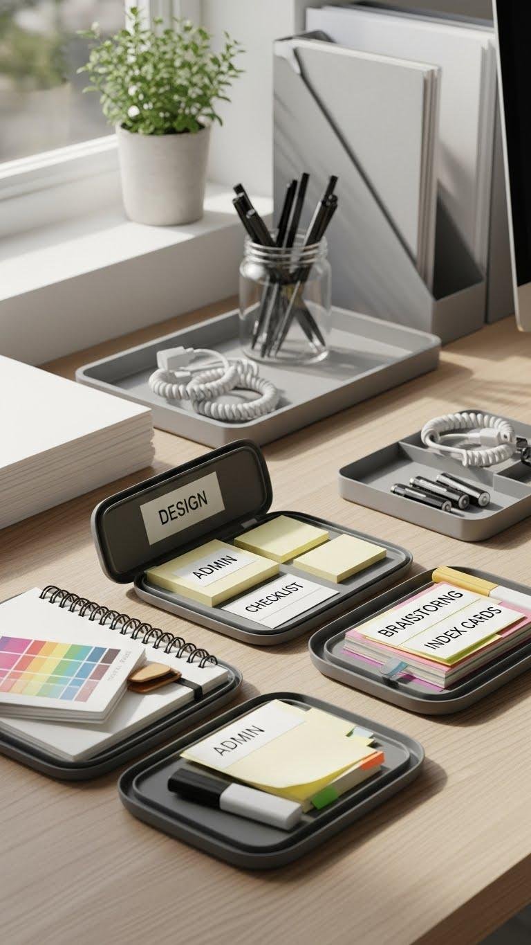 Set up compact, task-specific kits so you can grab what you need and get to work fast. Curate Task kits for design, admin, and brainstorming—labelled, portable, and minimal. Position Supply stations within reach: paper, pens, chargers, spare batteries. You’ll move freely, finish tasks with clarity, and enjoy an uncluttered desk that supports focused, efficient flow without unnecessary extras.