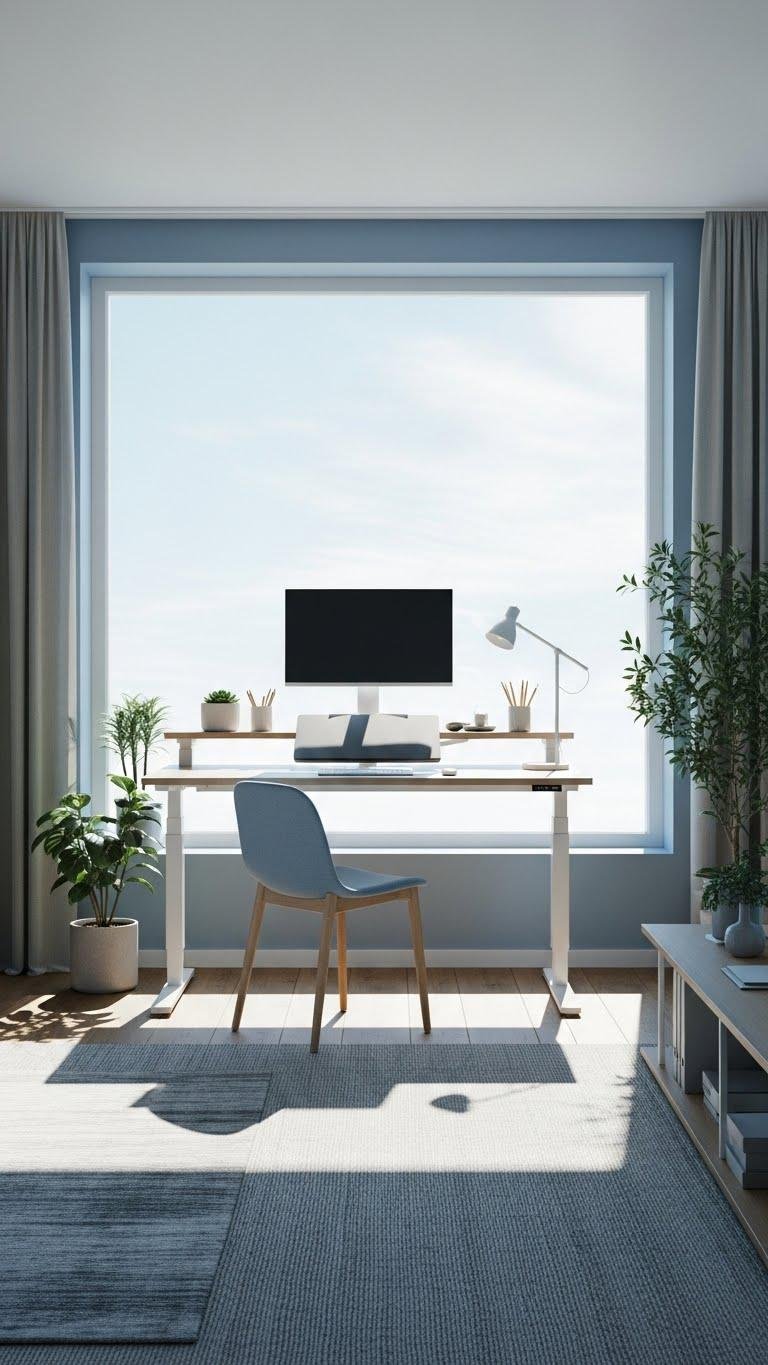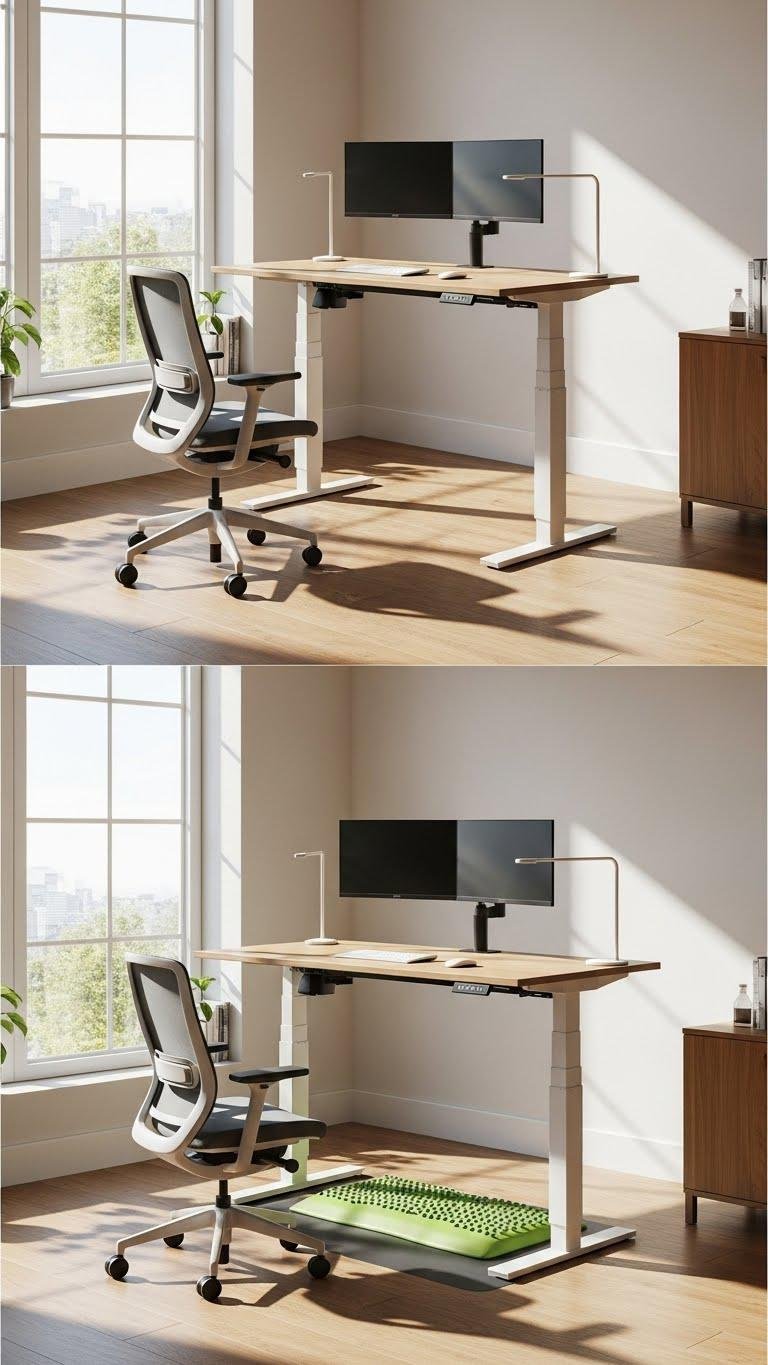 Add an anti fatigue mat for comfort during standing stretches, and position monitors and lighting for open, uncluttered movement that supports focus and autonomy.