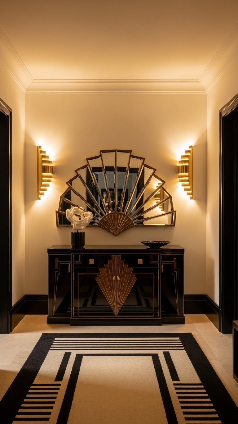 Drawing inspiration from geometric glamour, you’ll greet guests with an Art Deco entry that balances bold symmetry and warm brass shine—think fan-shaped mirrors, inlaid wood or black lacquer console, and a stepped light fixture that anchors the space.