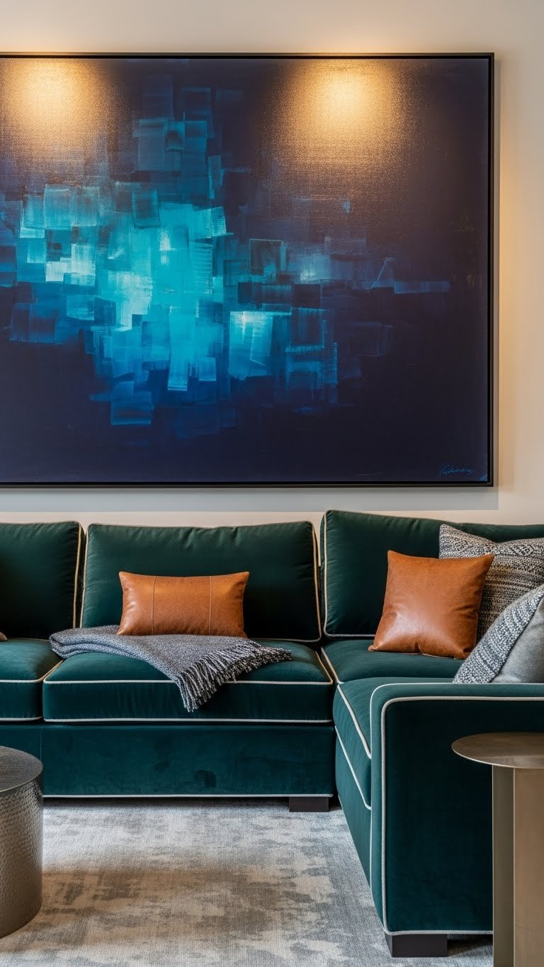 Velvet Sectional Anchored by Bold Artwork