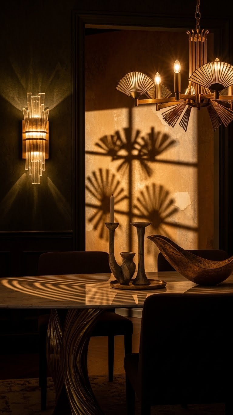 Make a bold pivot with lighting that reads like jewelry for the room: choose fixtures with Art Deco geometry—stepped forms, sunburst motifs, and fan-shaped brass details—to lift the dining space into sculptural territory. You’ll pick a geometric pendant over the table and layer with an art glass sconce on the wall. Let bold lines, warm metals, and crafted glass free your style and anchor joyful gatherings.