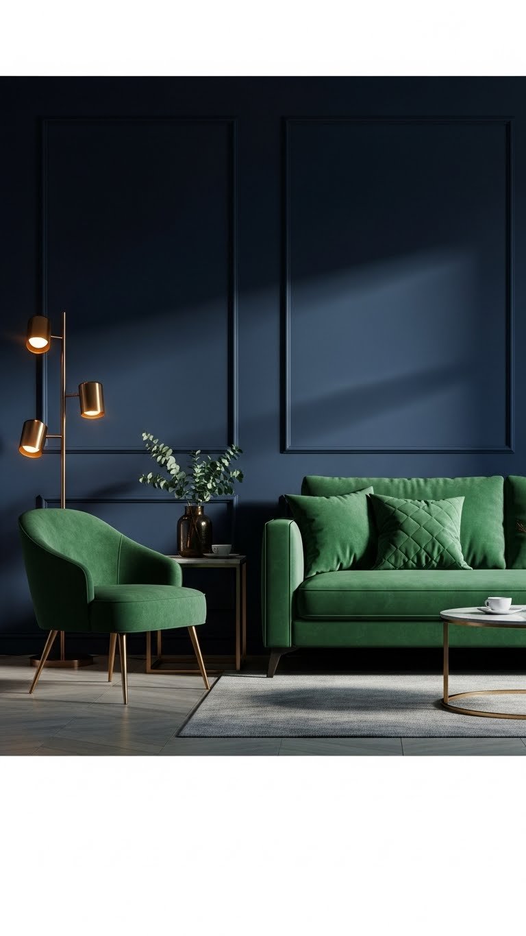 When you pair bold emerald with deep navy, the room immediately feels intentional and modern — a rich, confident palette that reads luxe without being fussy.