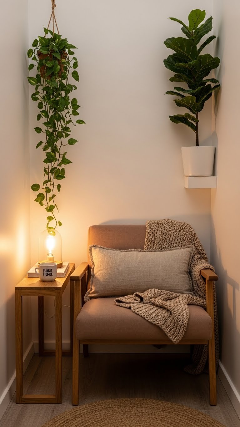 Choose a compact chair or bench to define a micro nook, layer a throw and tactile pillow, add a slim side table, and hang vertical greenery to lift the eye. Keep color minimal for calm freedom.