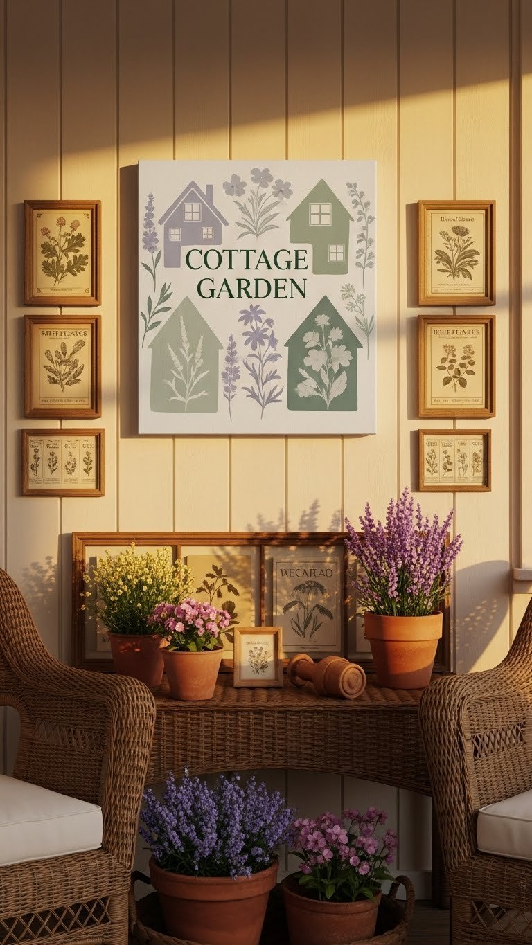 When you hang a cottage garden canvas on your porch wall, it instantly becomes the focal point that ties together your florals, wicker accents, and muted pastels; choose a print with soft brushstrokes and gentle color blends to echo the porch’s relaxed, homey vibe.